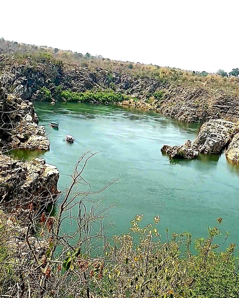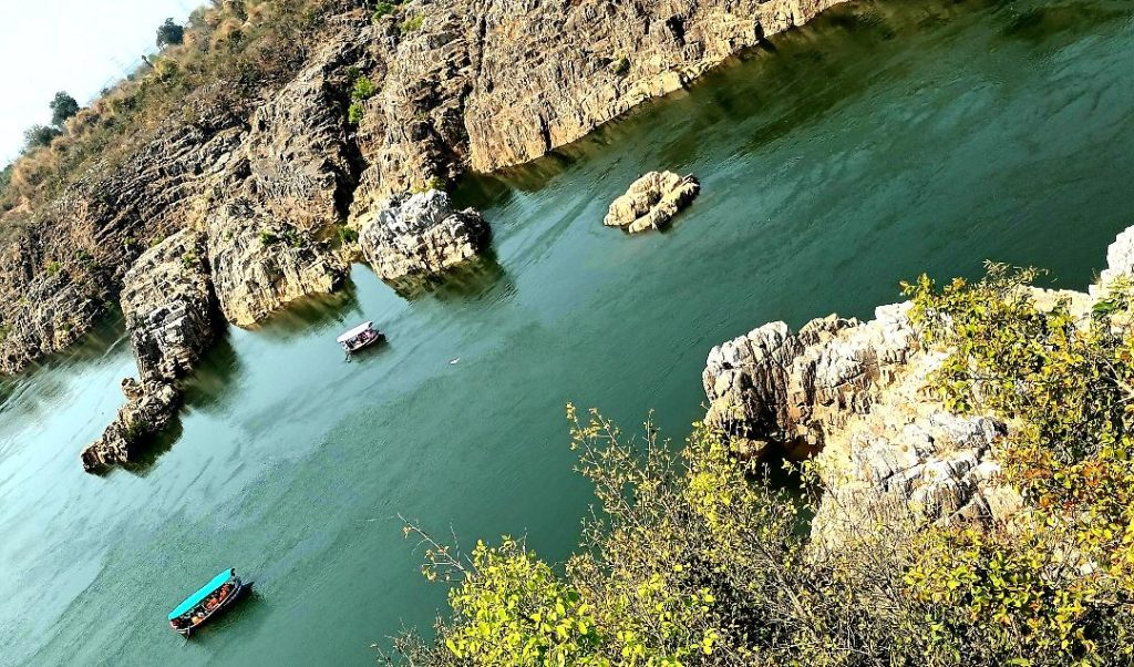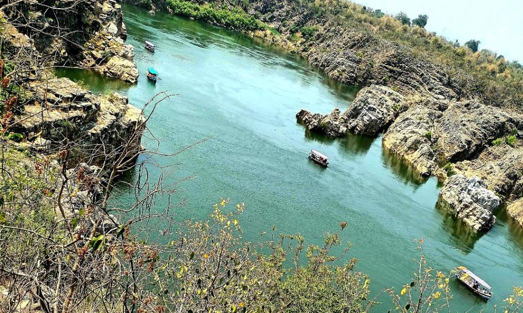 Apart from the marble rocks, the major attraction at Bhedaghat is the waterfall known as Dhuandhar which gives an appearance of the white smoke or a mass of mist coming out of the river. Here the otherwise placid river becomes turbulent as it plunges to a considerable depth presenting an awesome and picturesque spectacle. Owning to the fast-flowing river and constant erosion of rocks on the sides of gorge, the size, shape and volume of the falls too have undergone change over a period of time. While sailing in the river between the marble rocks, one could see a rather narrow point where high rising marble rocks on both sides come very close. Consequently, the monkeys in the area easily jump across them and the point is named as ‘Bandar Kodini’. Sailing on a boat through the marble rocks at Bhedaghat during a moonlit night gives a divine experience and pleasure to the people, particularly the young loving couples.