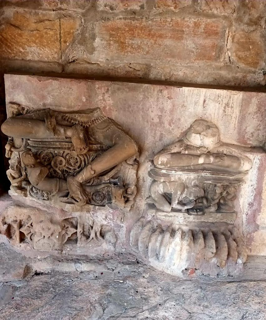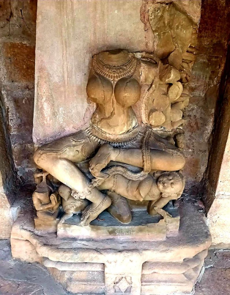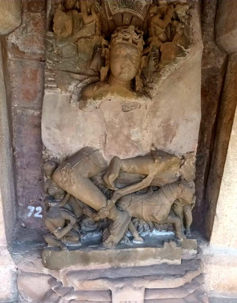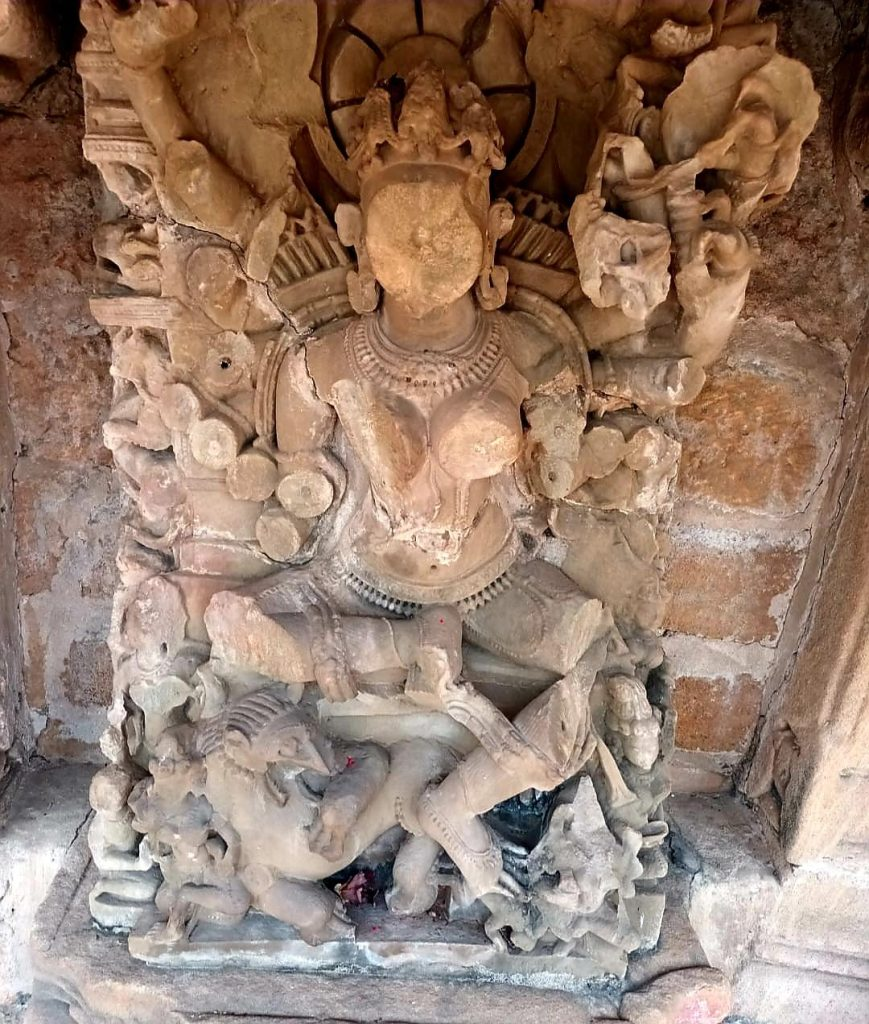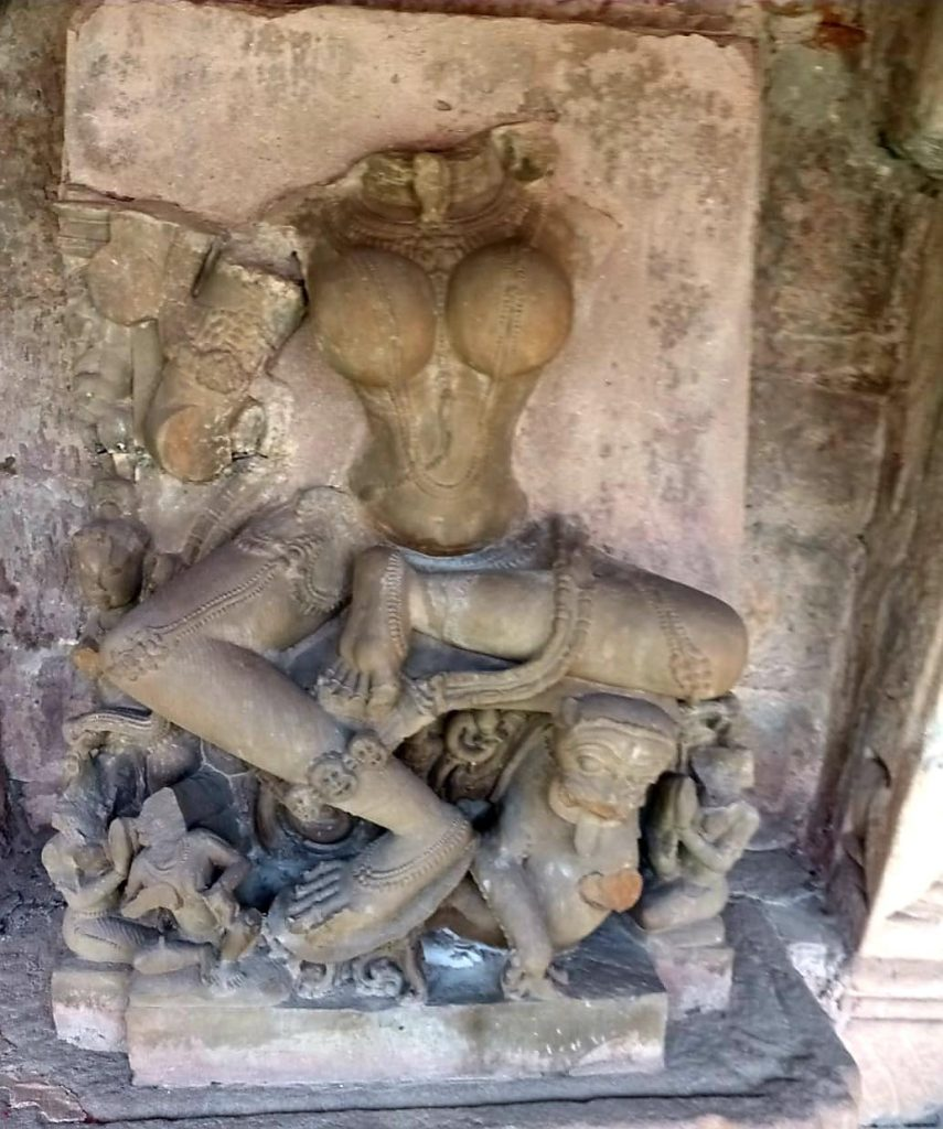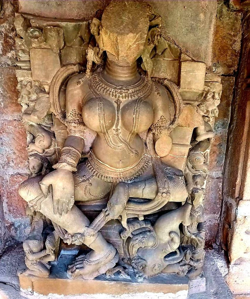 As the temple complex is an acclaimed ASI monument, the Yogini statues have been numbered and named by the Archaeological Survey of India. One can hardly notice any statue intact as most of them are severely damaged and defaced, and in many cases, large chunks of the sculptures are totally missing. The condition of the statues clearly suggests that there was a major event of sabotage and cataclysm at the premises during the history of temple. In some cases, the Yoginis are headless, in other cases they are without face and hands; in certain cases, the breasts have been deliberately chopped off using sharp weapons; one could even find statues of the female deity where entire trunk and head is missing above the waist. In short, the statues of Yoginis present a bizarre scene of various degrees of sabotage or vandalism suggesting that the tyrants and felons deliberately rendered the premises desecrated and profane for the future generations of the devotees (Hindus) to feel embarrassment, shame and pain about what was done to their shrine and deities by the invaders…undoubtedly a heinous act of sin and sacrilege that only people with the demonic attributes would indulge in. Here only a few images revealing the gory and sordid details of what the Islamic invaders of the Mughal era did to this magnificent temple of the Hindu faith but also representative of their beautiful art and culture.