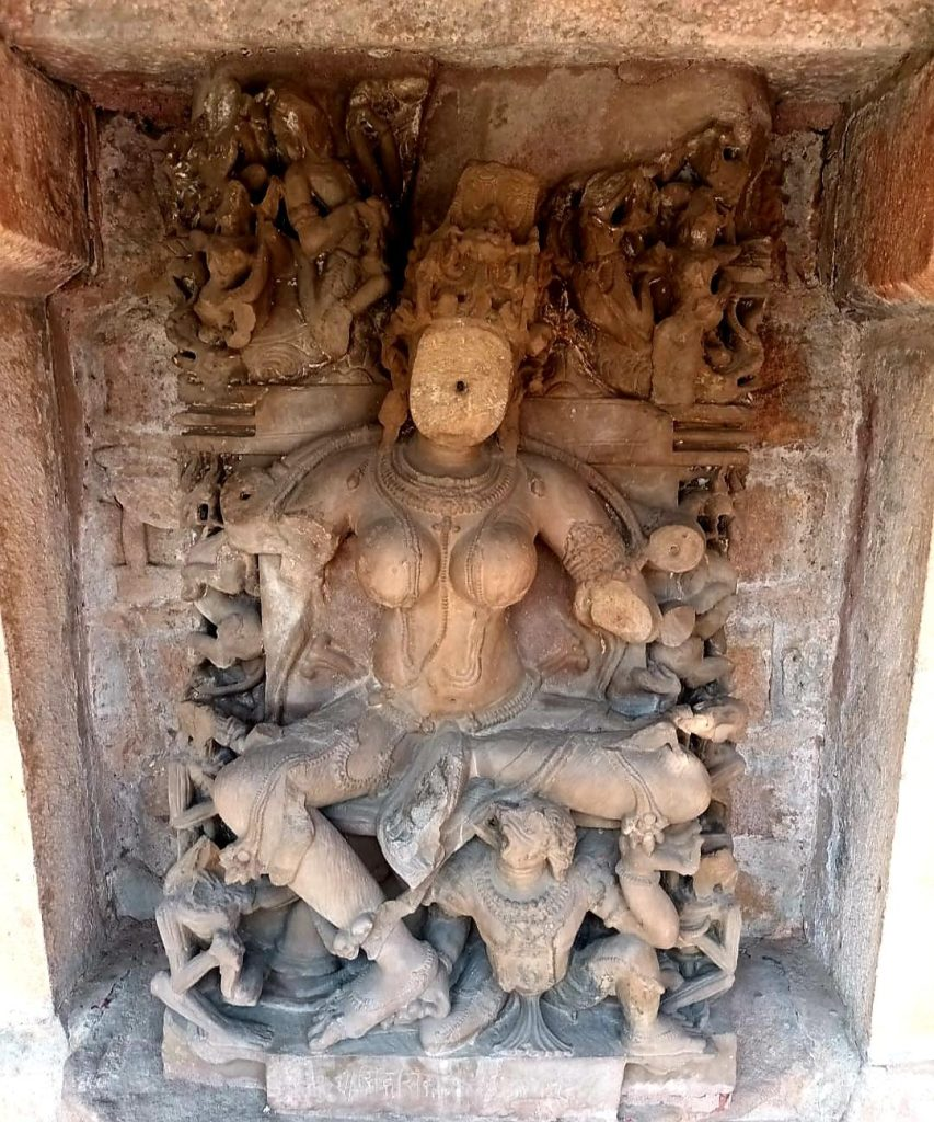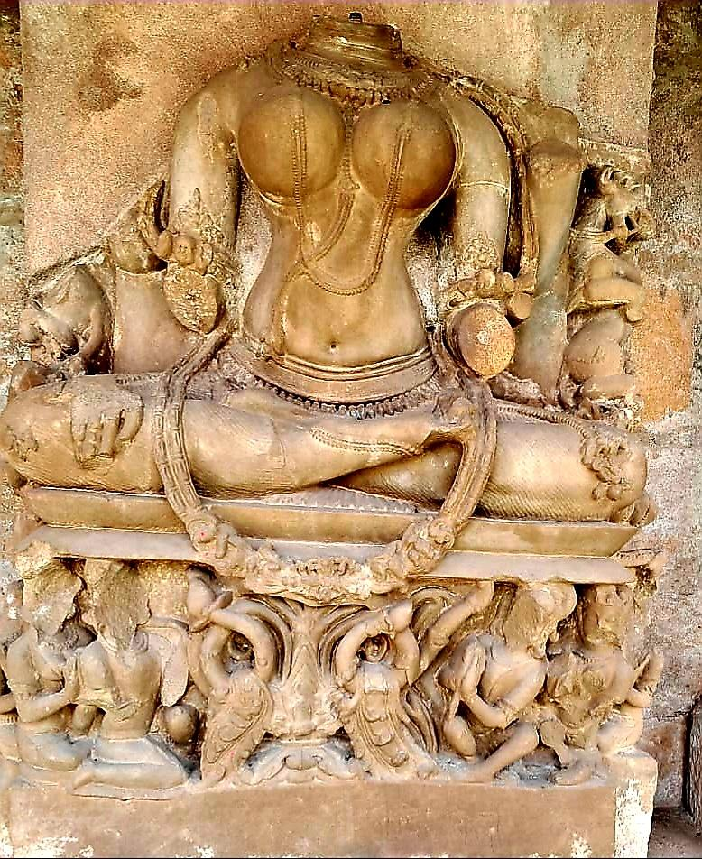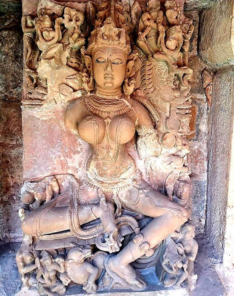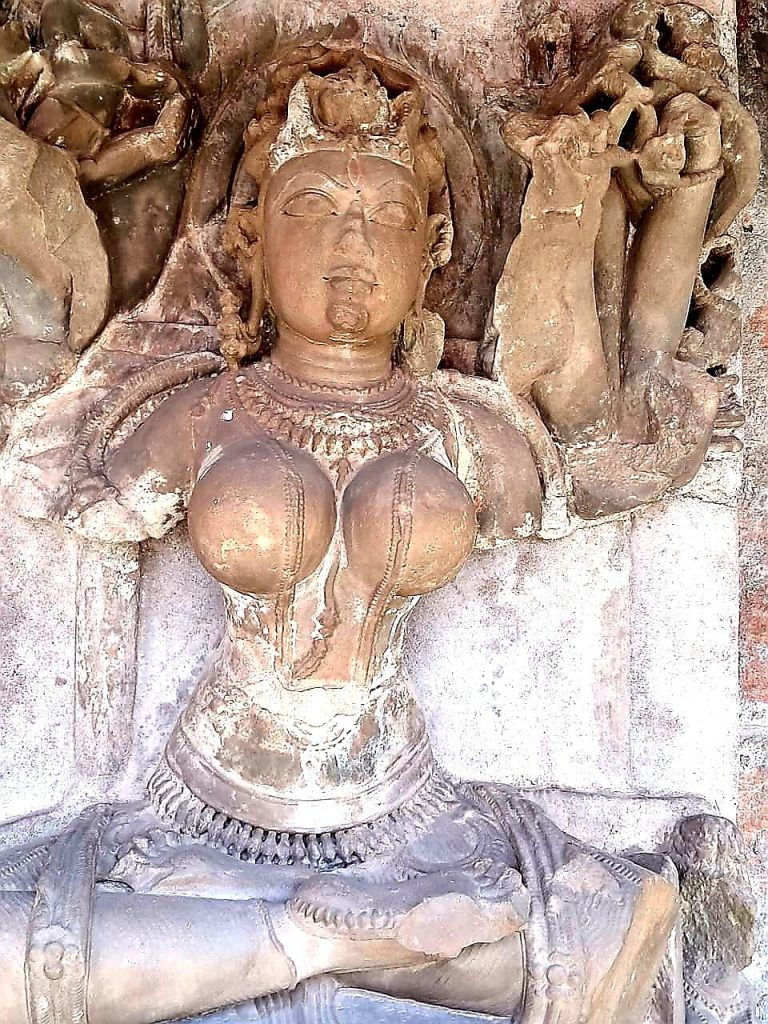 Depiction of the nude body in the classic Indian art, be it human or divine, was not a taboo during the ancient and even early medieval times and the same could be observed through various arts and crafts particularly among the ancient temple sculptures and paintings. The female nude was a common subject particularly in temple sculptures artfully symbolizing sensuality and fertility. Such common examples are temples at Khajuraho in Madhya Pradesh as well as the caves of Ajanta and Ellora in Maharashtra. The depiction of the female nudity was often linked with the concept of Shakti, thereby symbolizing the feminine divine energy and creative power through such idols/images. One of the experts of Indian and south Asian Art, Vidya Dehejia has described Chausath Yoginis’ form as “mature, voluptuous beauties, generously endowed with ample hips and heavy melon-like breasts”. These stone idols of female deities are bare down to the waist but heavily adorned with ornaments like earrings, necklaces, garlands, armlets, and bracelets. Then on their hips, they carry a jewelled girdle supporting rather frail ankle-length skirt. Notwithstanding, all Yoginis have attributes of divinity, with their faces and aura dignified, majestic and unsmiling, suggesting an aspect of Devi/Shakti.