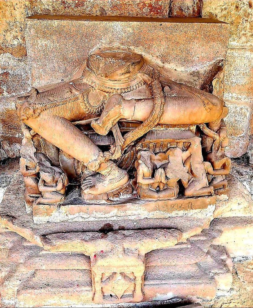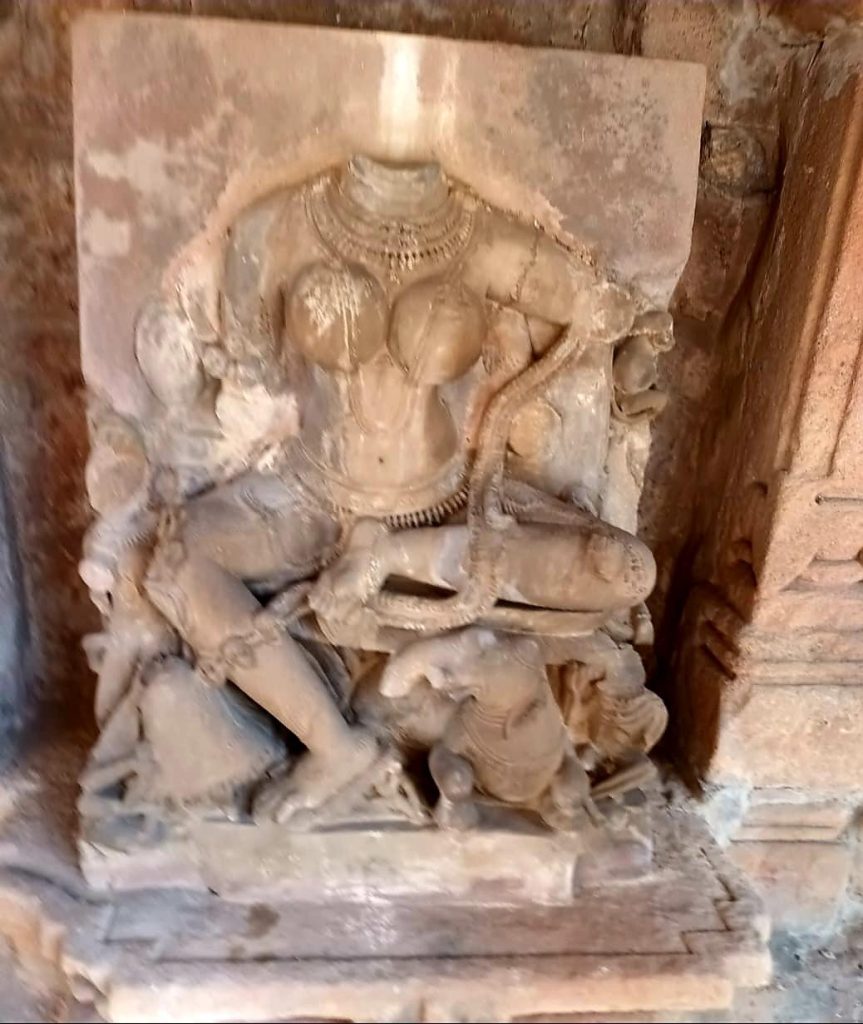 Towards the middle portion of the inner circle, the Gouri-Shankar Temple is located. According to available reports, it was constructed by Queen Alhanadevi of the Kalchuri Dynasty most probably of their Tripuri Branch in 1155 CE. Much information about the queen is not available and the aforesaid suggestion is made based on an inscription on a slab at the temple. Most probably it came up nearly two centuries after the original Chausath Yogini Temple. The sanctum sanctorum of the temple contains idol of God Shiva and Goddess Parvati riding on a bull (a rare combination) while outside the statue of a stone Bull is also located. As the Chausath Yogini Temple was severely vandalized during the Mughal period, it appears beyond comprehension that the Gauri-Shankar Temple remained undamaged while the Yoginis were so vandalized. In author’s view, a possibility cannot be entirely ruled out about the reconstruction/repair of the Gauri-Shankar Temple on a later date. Some scholarly accounts of historians and Indologists are also available suggesting aura of the temple, vintage and role of certain kings in its construction and Bhairava (dancing Shiva) as central deity at a certain point of time; however, this author does not want to delve upon these accounts unsure about their credibility.