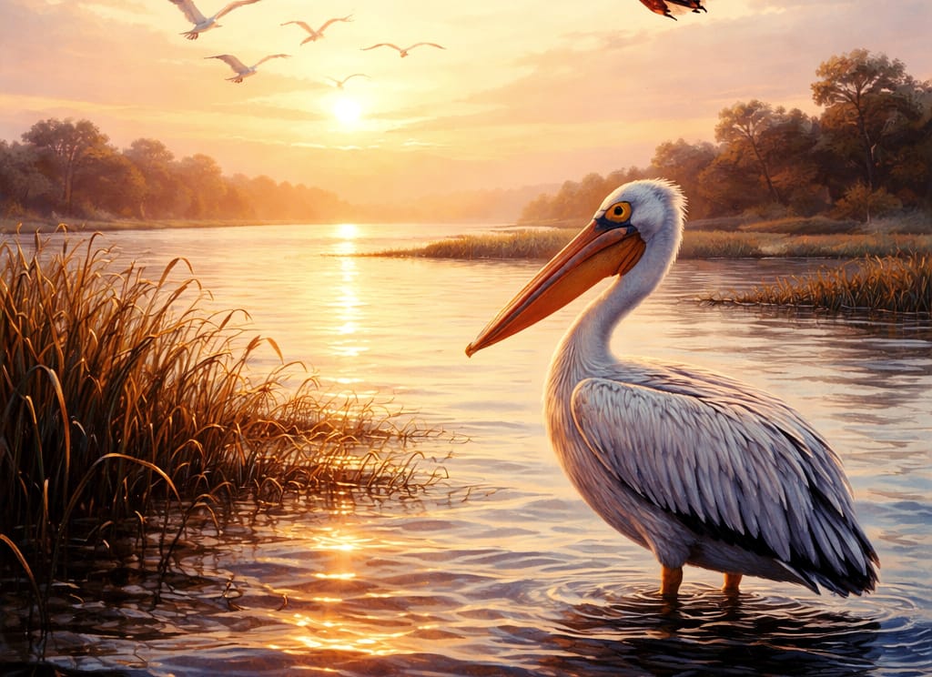 The pelican drifts through a waking dream—