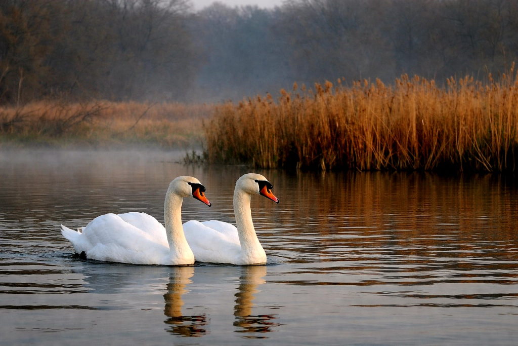 In reed-woven lands, swans dwell and feed